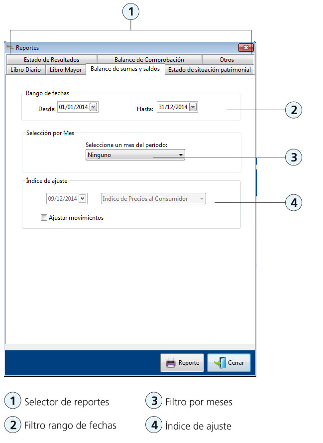 Selección por mes También si lo desea puede seleccionar rápidamente un filtro por mes (3), despliegue la lista y encontrará todos los meses correspondientes al período contable. Este filtro setea el rango de fechas (3) con las fechas de Inicio y Fin del mes seleccionado.