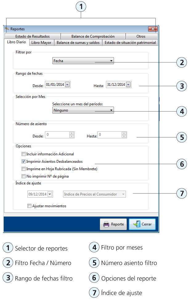 Si despliega la lista del filtro (2) podrá seleccionar Número de asiento, se habilitará la opción Número de asiento (5), por defecto el rango abarcará todo el período, seleccione el rango deseado, modificando el número Desde y el número Hasta.