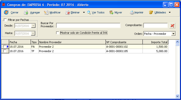 Mover: Podemos mover un comprobante de compra a otro período. Esto es muy útil en caso de equivocaciones.