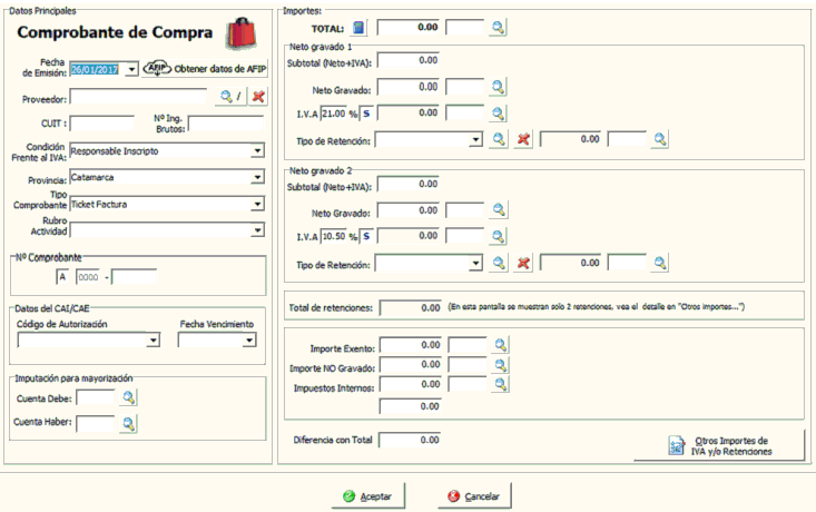 Número de CUIT, Número de Ingresos Brutos, Condición frente al IVA, Provincia y Rubro o Actividad del proveedor se cargarán automáticamente, si este se encuentra en el archivo de proveedores de la empresa.