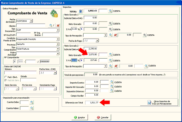 Ejemplo de carga de un comprobante con alícuota de 10.50% e importe exento