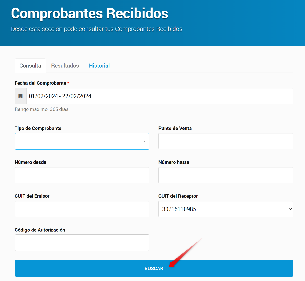 Dentro de la pestaña Consulta seleccione el rango de fechas a descargar y presione Buscar.