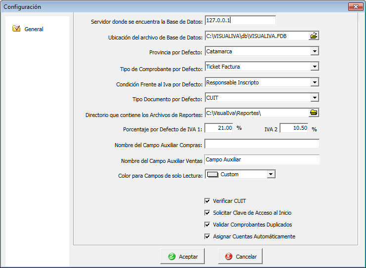 Por ejemplo cuando se agregue un comprobante de compras o de ventas el porcentaje de iva que se tomara por defecto sera del 21.00 %. Este valor se puede cambiar en este lugar; de la misma forma con los demás valores.