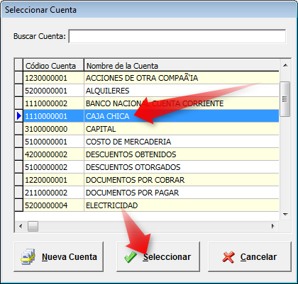Pudiendo elegir otra cuenta dentro cada ítem del comprobante si así lo requiere. Para ello presione la lupa y seleccione la cuenta deseada.