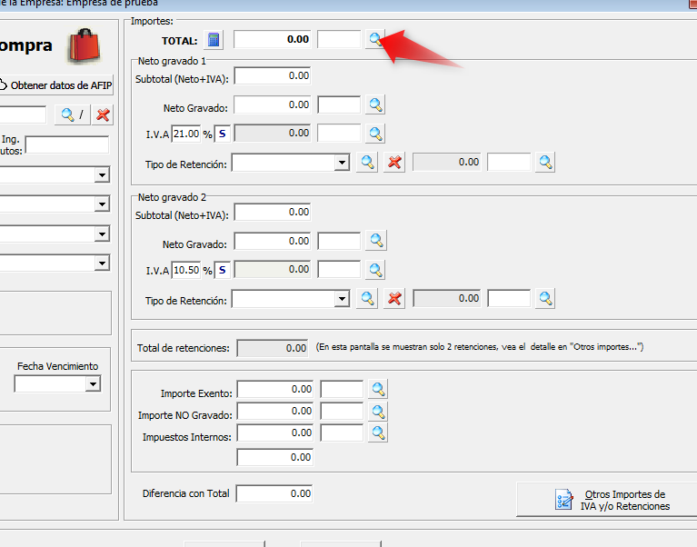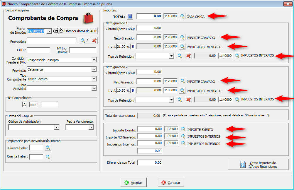 Para poder discriminar cada importe del comprobante en una cuenta distinta debe picarse la lupa de selección a la derecha de cada importe.