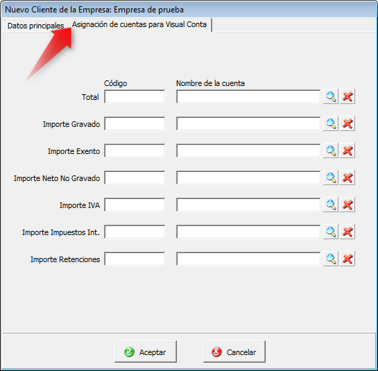 Ahora dentro de la ficha de cada proveedor y/o cliente podrá asignar las cuentas para configurar el asiento contable personalizado, para facilitar la carga de comprobantes y exportación a Visual Conta. Para ello seleccione la pestaña “Asignación de cuentas para Visual Conta” y proceda a confeccionar el asiento del cliente o proveedor cargando cada una de las cuentas correspondientes a cada ítem, presionando la lupa para buscar la cuenta deseada.