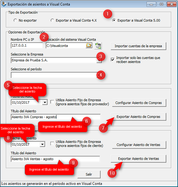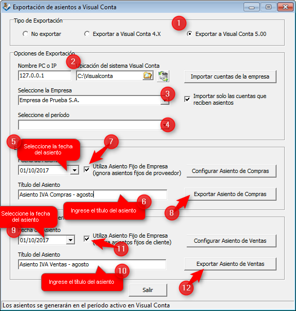 Al terminar un período, puede generar el asiento de compras o ventas según las cuentas asignadas automáticamente desde el asiento fijo de la empresa, de asignación libre y asignados desde el asiento de cliente o proveedor.