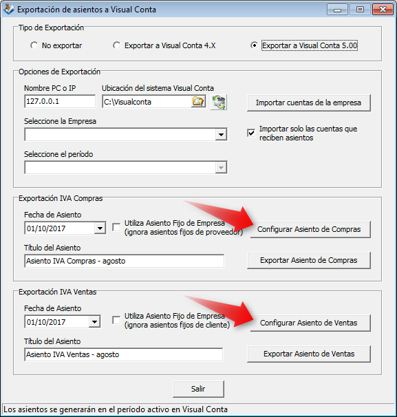 Para ello configure los Asientos de Compras y Ventas en la pantalla de exportación como se indica en el punto 1- Asiento Fijo de la empresa.