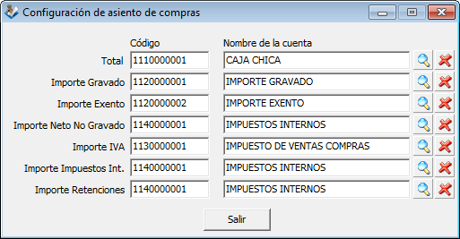 Para configurar los Asientos Fijos de Compras y Ventas en la pantalla de exportación, seleccione “Configurar Asiento de Compras” o “Configurar Asiento de Ventas” y luego complete el asiento cargando cada una de las cuentas correspondientes a cada ítem, presionando la lupa para buscar la cuenta deseada. Para poder guardar el asiento debe poseer todas las cuentas, caso contrario no es válido y no se puede guardar. Al finalizar presione Salir.