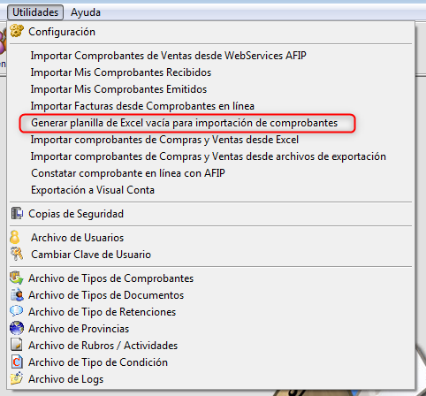 Ingrese a Utilidades y seleccione la opción "Generar planilla de Excel vaía para importación de comprobantes"