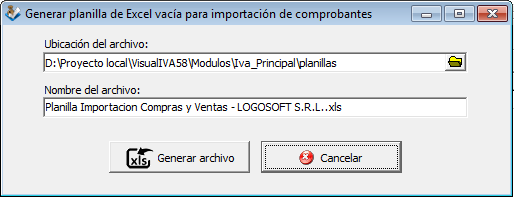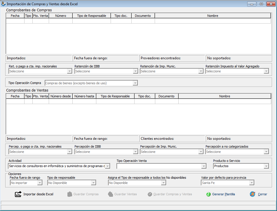 Al recibir un archivo Excel completo, para poder importarlo, ingrese a Utilidades y seleccione Importar comprobantes de Compras y Ventas desde Excel", verá la pantalla tal como se muestra en la siguiente imagen: