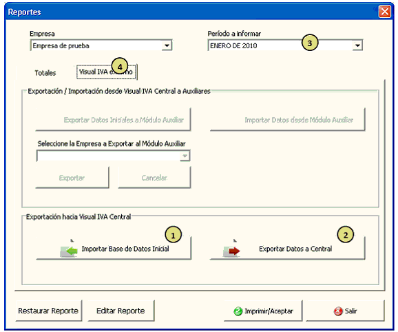 En la pantalla Reportes seleccione la pestaña Visual IVA externo (3) allí presione el botón “Exportar Datos a Central" (2)