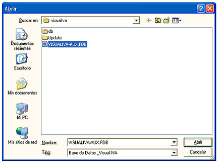 Presione el botón “Importar Base de Datos Inicial” (1) en la ventana Abrir, seleccione el archivo VISUALIVA-AUX.FDB, que recibió de Visual Iva central con la configuración inicial de su sistema y presione Abrir.