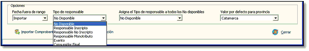 El campo Tipo de Responsable, no es provisto, puede seleccionar uno a uno, o bien seleccionar uno por defecto que será asignado a todos los comprobantes. Caso contrario será cargado como Tipo de responsable: “No Disponible”. Luego desde la ventana principal de Compras o Ventas puede filtrar por dicha condición para modificarlos desde la edición de los comprobantes. No poseer configurado correctamente dicho campo puede afectar el resultado de algunos reportes de Visual IVA.