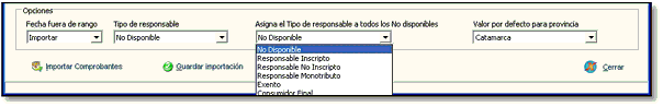 Puede asignar un tipo de responsable a todos los comprobantes que posean No Disponible, abra el selector y seleccione una opción para modificarlos.
