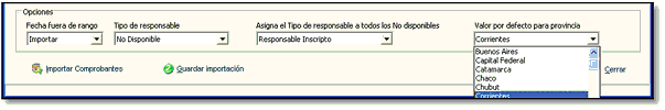 El campo provincia, no es provisto, por ello deberá seleccionar una provincia por defecto que se asignará a todos los comprobantes (Luego puede modificarlas desde la edición de los comprobantes), a menos que el sistema posea cargado el Cliente o Proveedor, caso en el que tomará la provincia que este posea asignada el cliente o proveedor en el archivo de Visual Iva.
