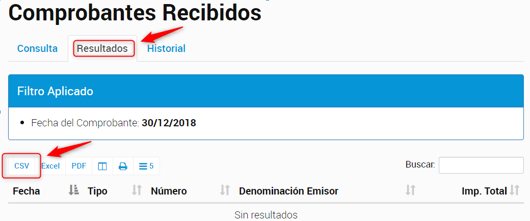 Una vez indicado el período a importar, la web le permitirá descargar los comprobantes en varios formatos, deberá seleccionar "CSV", lo cual generará un archivo de texto que podrá importar en Visual IVA.