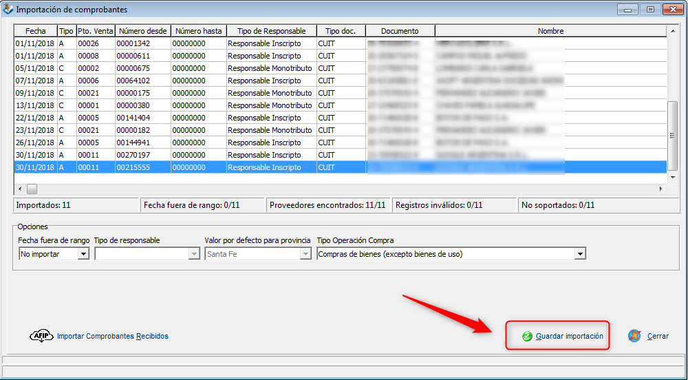 Una vez seleccionado el archivo se carga la información en la grilla, indique el tipo de operación de compra a asignar a los comprobantes, y luego genere el almacenamiento de los comprobantes pulsando "Guardar Importación".