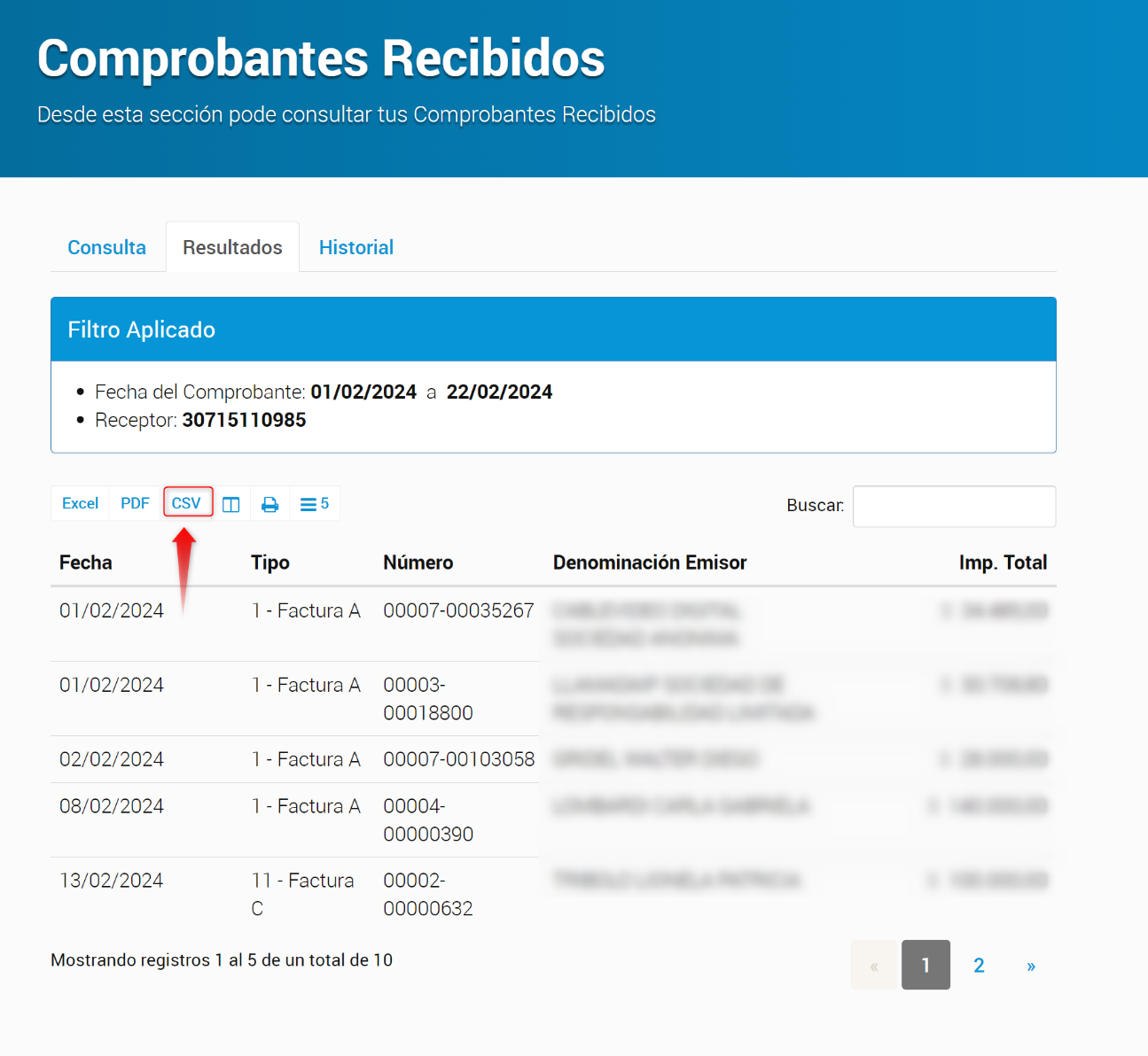 Una vez indicado el período a importar, la web le permitirá descargar los comprobantes en varios formatos, deberá seleccionar "CSV", lo cual generará un archivo comprimido .ZIP que podrá importar en Visual IVA.