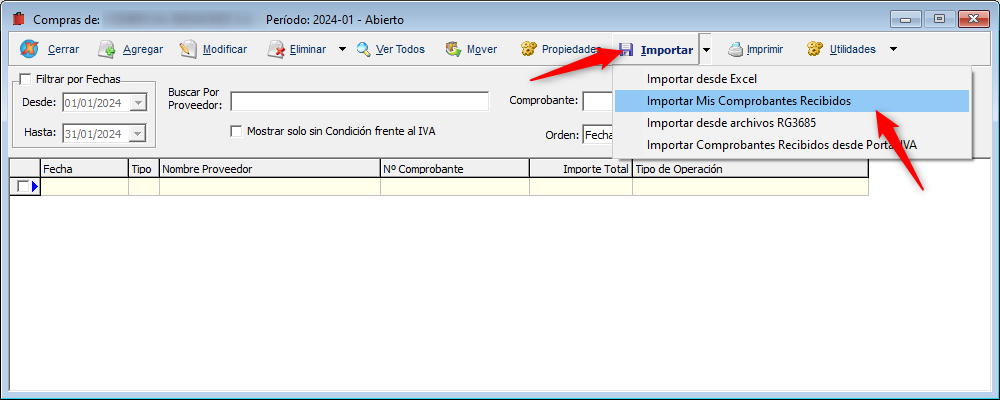 Una vez obtenido el archivo ZIP, ingrese a Utilidades > Importar Mis Comprobantes, o bien desde "Compras", ingrese a Importar > Importar Mis Comprobantes Recibidos