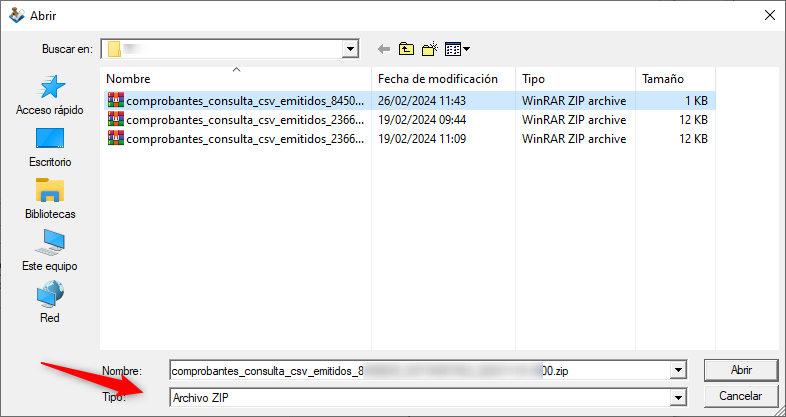 Atención: No es necesario descomprimir el archivo .ZIP, en el caso de haber sido descomprimido y extraído el archivo .CSV se debe cambiar al pie de la pantalla en “Tipo” por la opción “Archivo CSV”.