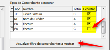 En el listado se muestran los “Tipos de comprobantes” de los comprobantes existentes en Visual IVA en el período activo, permitiendo desmarcar el Tipo de comprobante que no desee exportar a ARCA. Luego de marcar o desmarcar un Tipo de comprobante, se debe presionar el botón “Actualizar filtro de comprobantes a mostrar” para actualizar la lista.