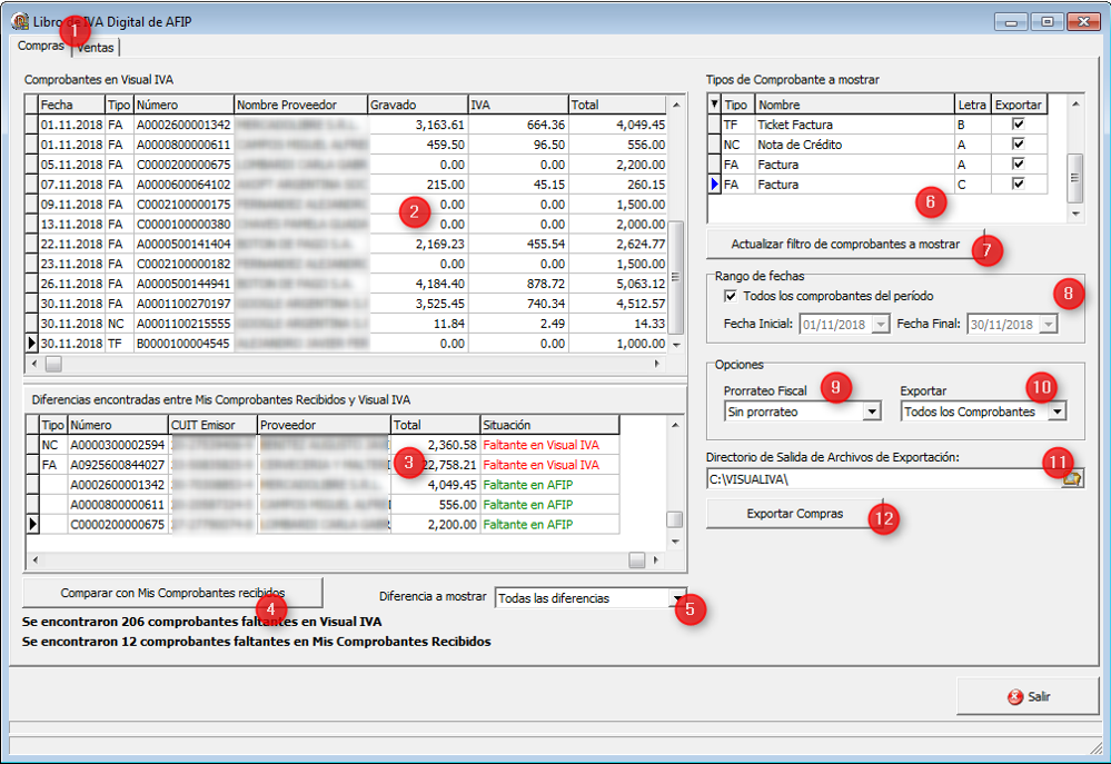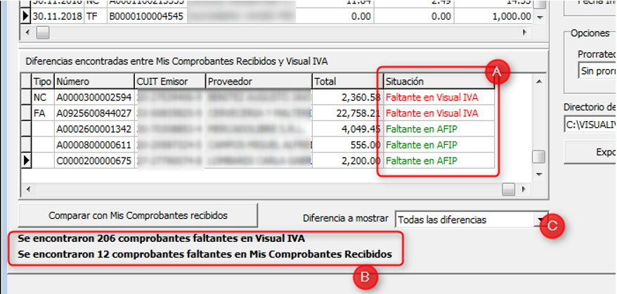 3 Listado de diferencias encontradas entre Visual IVA y ARCA, comparado con el archivo CSV de Mis Comprobantes Recibidos.