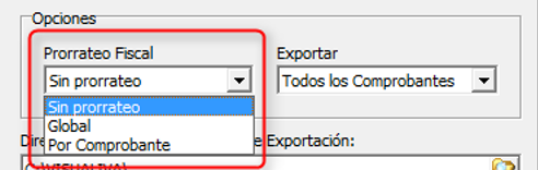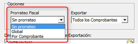 Seleccione la opción correcta para generar la exportación Sin prorrateo, compatible con Prorrateo Global, o por Comprobante. Según corresponda.