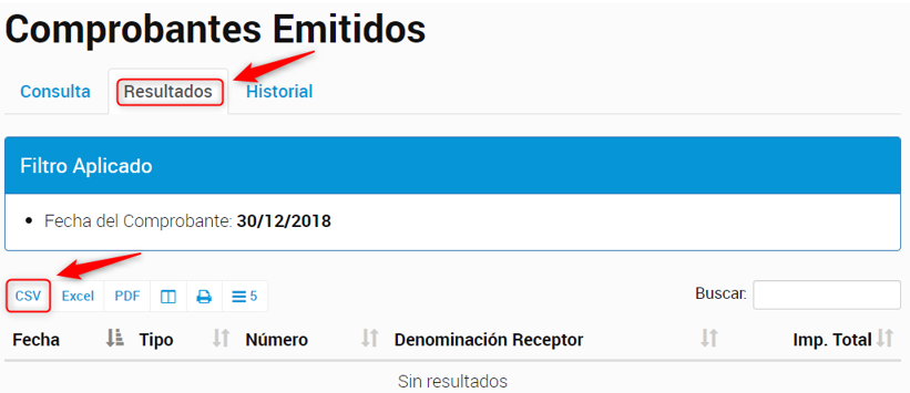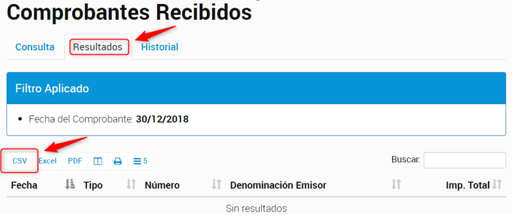 Una vez indicado el período a importar, la web le permitirá descargar los comprobantes en varios formatos, deberá seleccionar "CSV", lo cual generará un archivo de texto que podrá importar en Visual IVA.