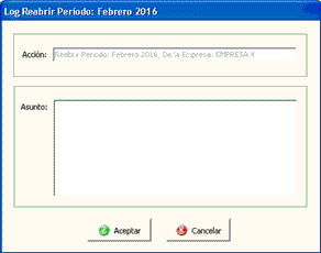 Aquí podrá registrar en el archivo de logs (Utilidades > Archivo de Logs) el motivo por el cual se abrió el período. Presione Aceptar y su período ya se encuentra abierto para realizar las modificaciones, para lo cual deberá activarlo.
