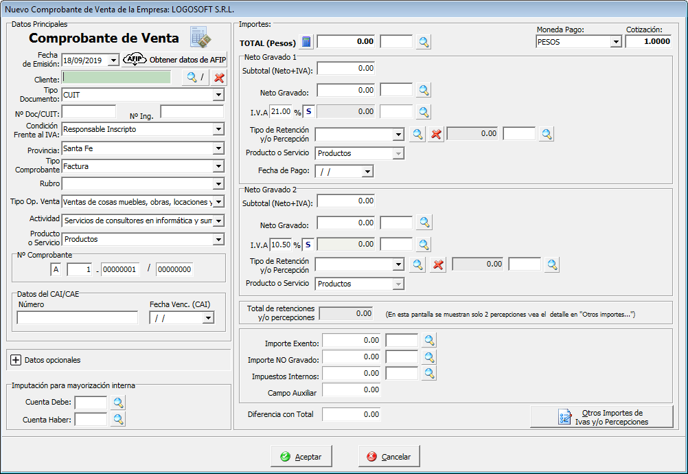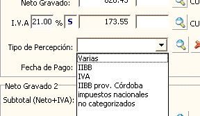 IVA: Predeterminadamente el sistema ofrece en el Neto Gravado 1, la alícuota de IVA del 21%, dicha alícuota puede modificarse por otra válida, cambiando el valor del porcentaje y presionando Enter.