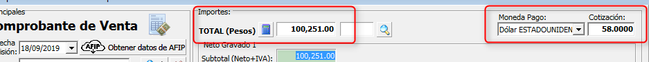 Moneda de pago y cotización: Los comprobantes que se emiten en moneda extranjera, poseen el Total en pesos, la Moneda extranjera y su cotización, para ello se utilizan los campos Moneda de pago y Cotización.
