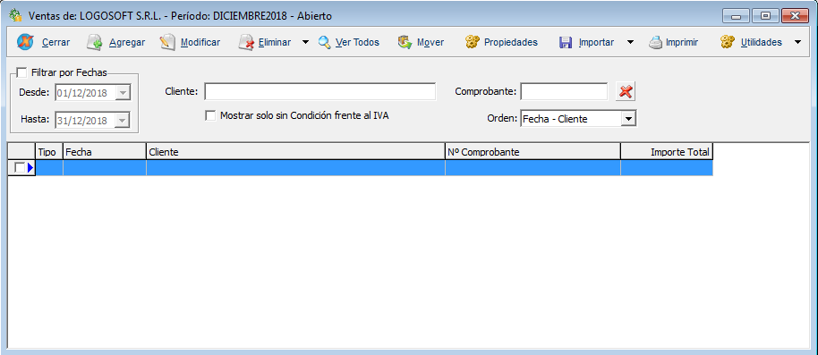 - Borrar Todos: Elimina definitivamente todos los comprobantes de ventas cargados en el período actual. Los datos eliminados no se podrán recuperar.