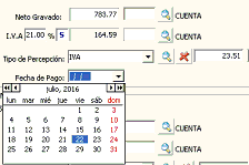 Despliegue el menú “Tipo de Percepción” y seleccione la percepción deseada, si la misma fue configurada en el archivo de percepciones con la correspondiente alícuota, el sistema calculará el importe automáticamente sobre el Importe Gravado.