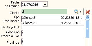 La búsqueda inteligente, también funciona ingresando el número de CUIT en el campo Cliente o en el campo CUIT. Debiendo ingresar el número de CUIT sin guiones, de igual manera se desplegará la lista para seleccionar el deseado. O ingrese el número completo (sin guiones) y el cliente se cargará automáticamente (siempre que se encuentre en el archivo de clientes de la empresa).